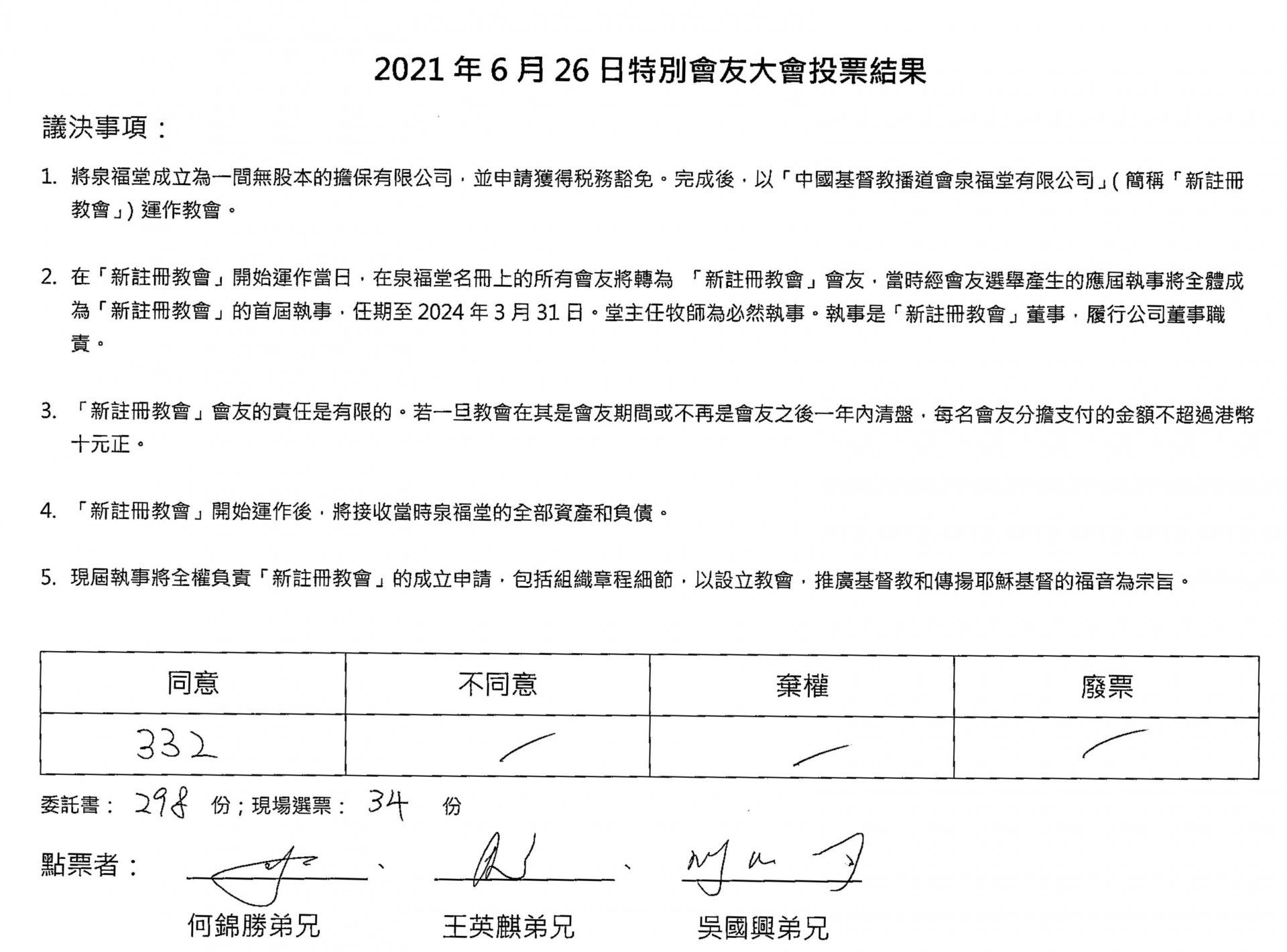 特別會友大會投票結果